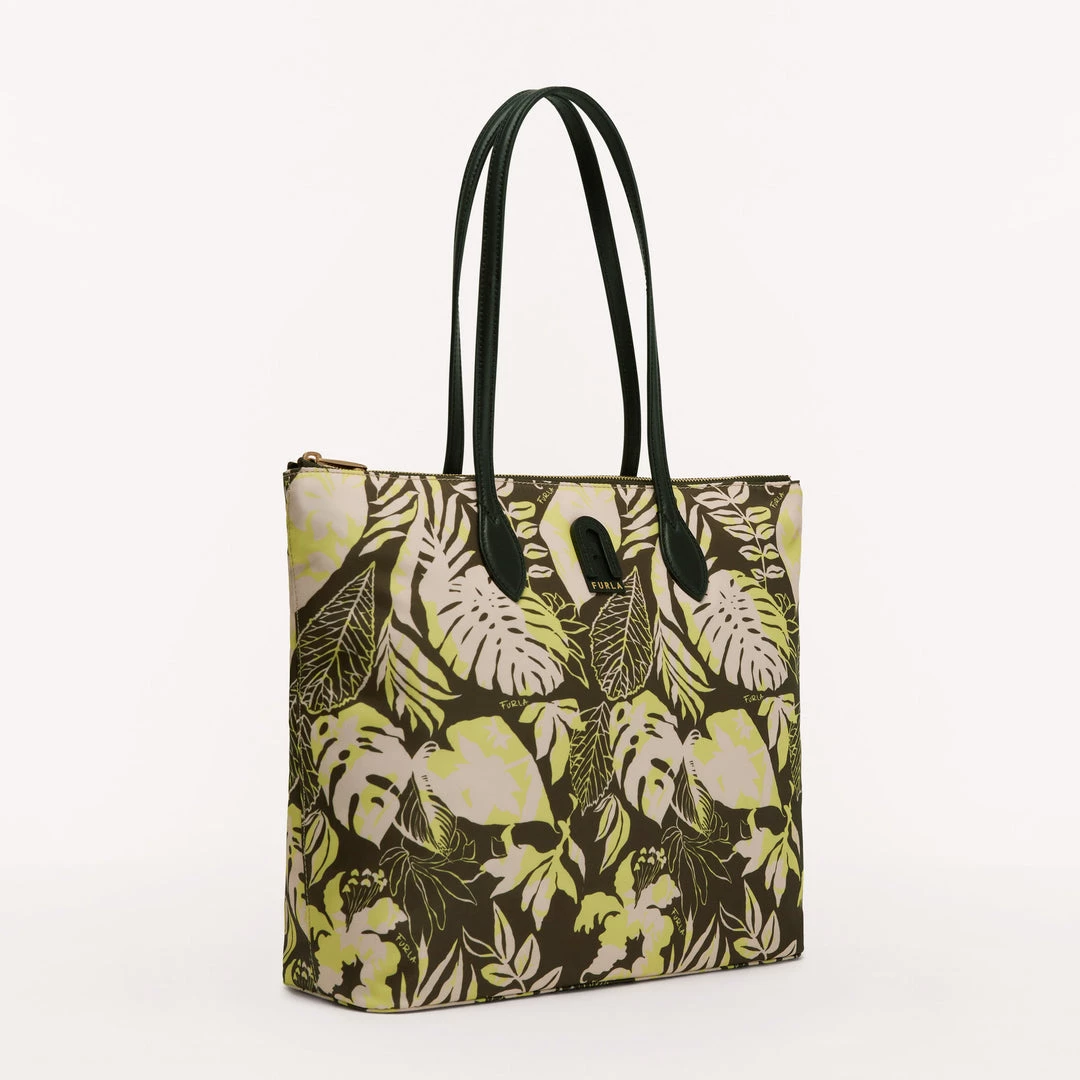 Furla Calipso is a large shopping bag, perfect for either everyday use or travelling. The model is made of nylon fabric with a leaf print and features a double long handle that allows you to wear it on the shoulder. The accessory is completed by a practical and functional inner open pochette to store your personal belongings.