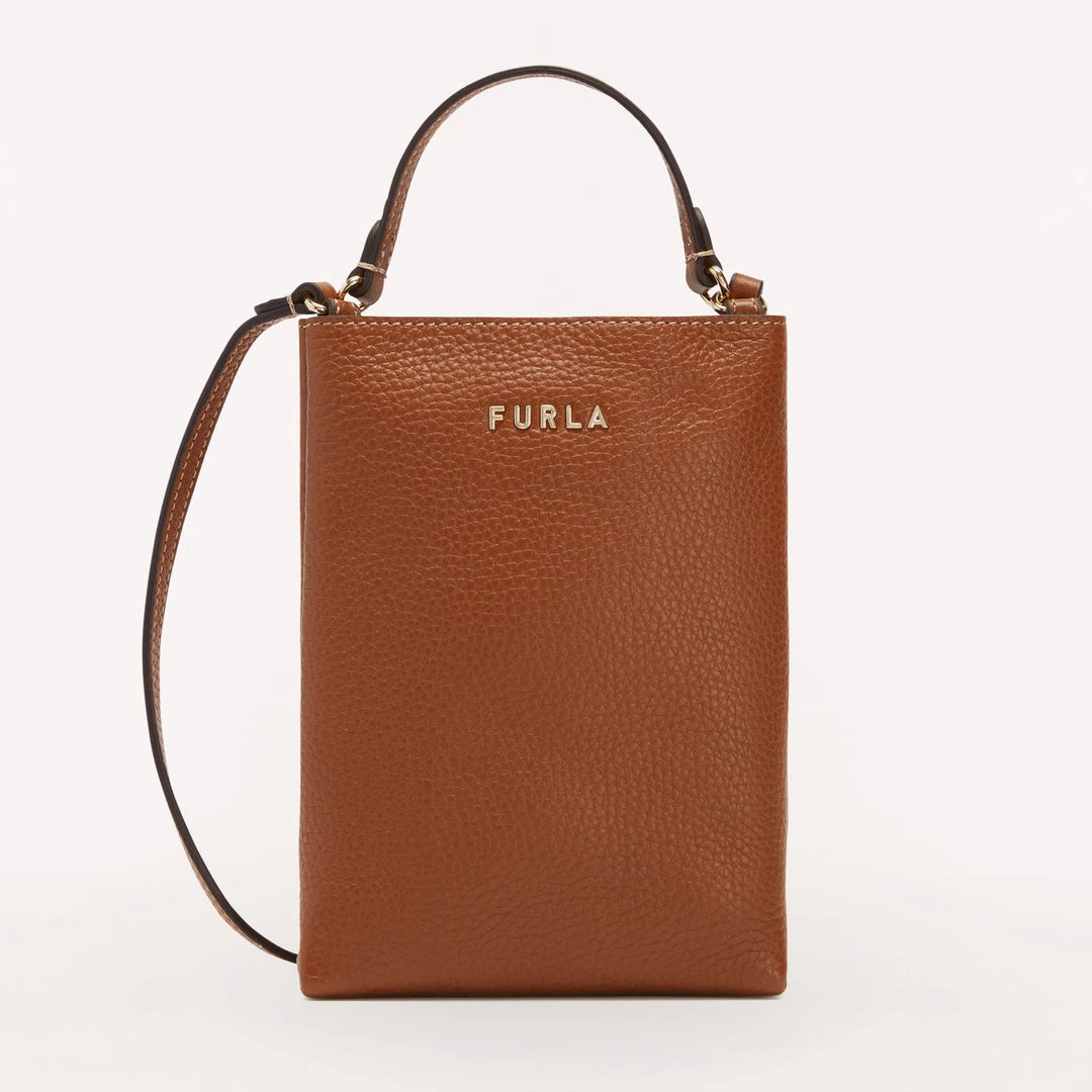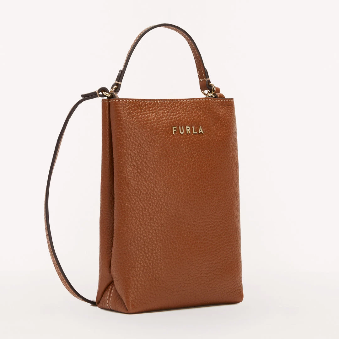 Furla Eos is a small phone case made from grained Keria calfskin. This piece comes with a handy, practical leather shoulder strap and a top handle, allowing you to carry it either by hand or on the shoulder. The vertical shape makes it ideal for safely storing even the largest smartphones, like the iPhone 13 Pro.