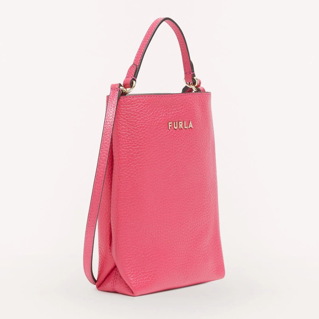 Furla Eos is a small phone case made from grained Keria calfskin. This piece comes with a handy, practical leather shoulder strap and a top handle, allowing you to carry it either by hand or on the shoulder. The vertical shape makes it ideal for safely storing even the largest smartphones, like the iPhone 13 Pro.