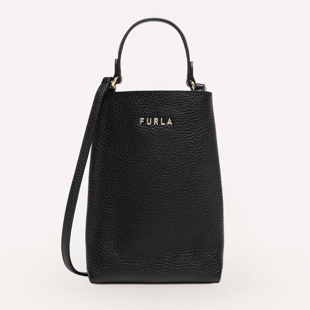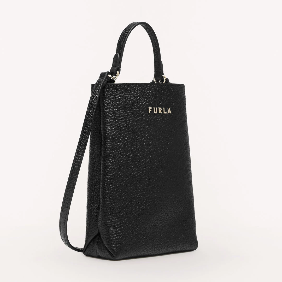 Furla Eos is a small phone case made from grained Keria calfskin. This piece comes with a handy, practical leather shoulder strap and a top handle, allowing you to carry it either by hand or on the shoulder. The vertical shape makes it ideal for safely storing even the largest smartphones, like the iPhone 13 Pro.