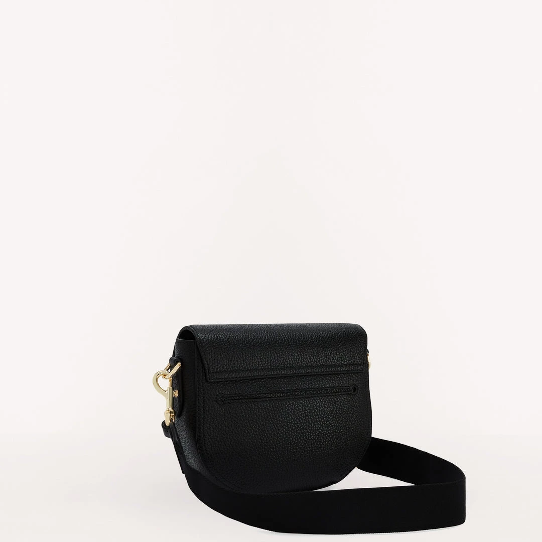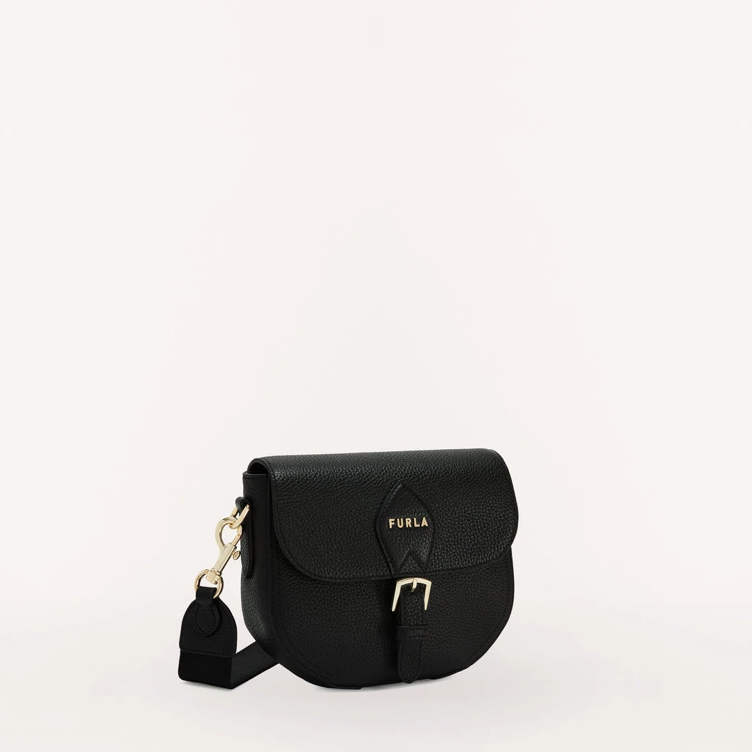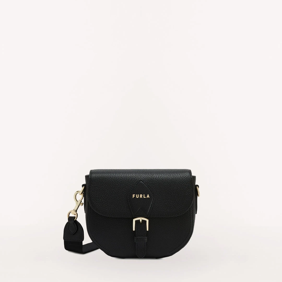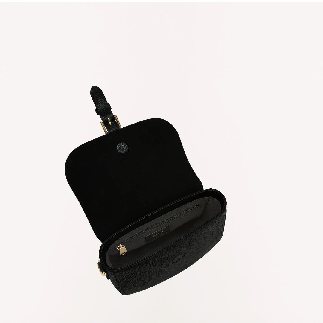 Furla Urania is a mini crossbody bag made from grained Keria calfskin. The rounded shape of this piece makes it perfect for sporty, casual looks. This accessory is complete with a flap and press-stud closure and an adjustable buckle embellished with the Furla logo punched on the front.