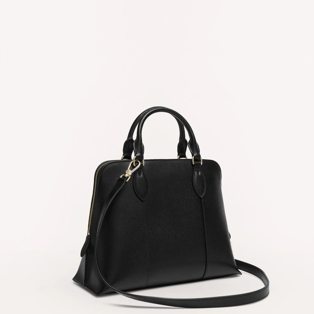 Furla Vittoria is a handbag made of Andromeda calfskin. The compact model is also designed to be worn on the shoulder or as a crossbody thanks to its adjustable and removable leather shoulder strap. A mini Arch logo padlock on the side and a galvanised Furla logo punched on the front completes this elegant accessory.